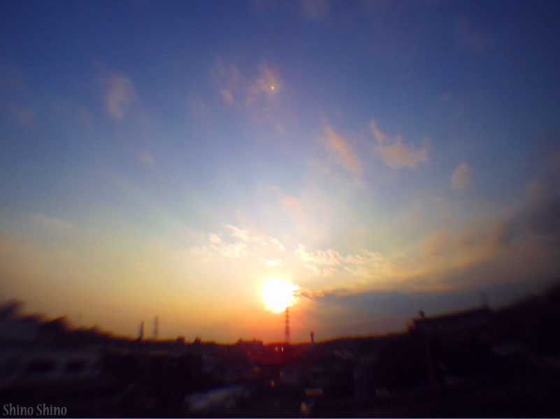 ▲自宅屋上からvivicam5050+魚眼レンズで撮影した夕景也。