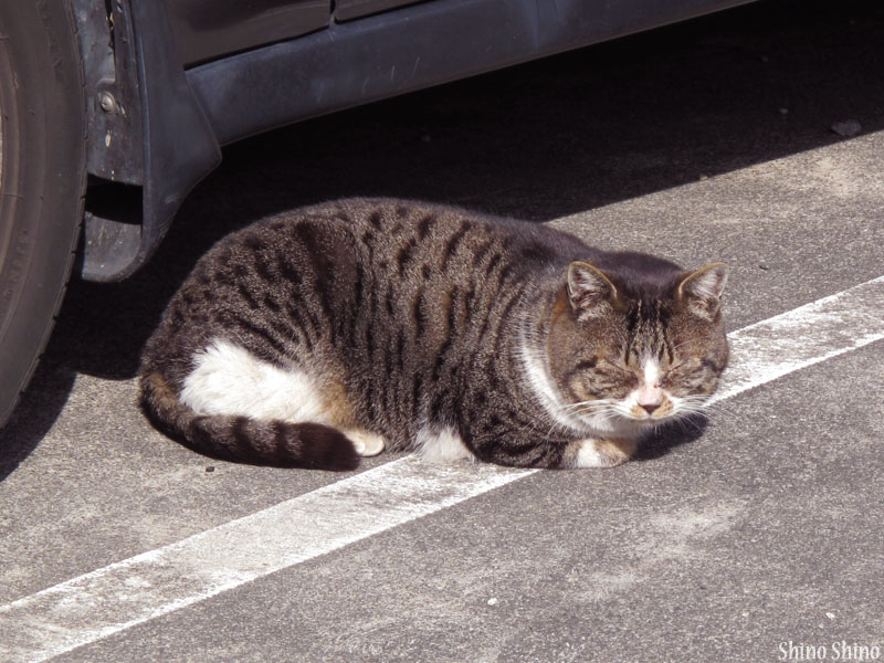 ▲日に当たりつつ、まぶしそうに寝ているネコさん。