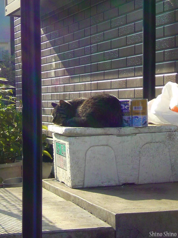 ▲ネコ缶の前でひなたぼっこしているトラ。W61Sにて撮影。