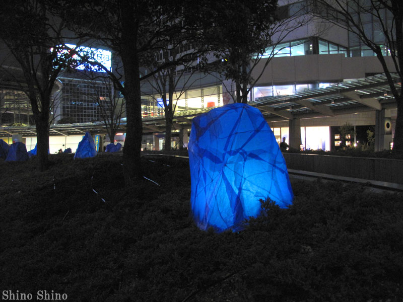 ▲ヒルズの花壇に多数設置されていた、青く光る石。
