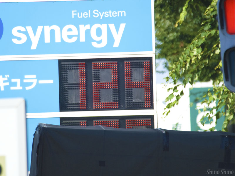 ▲遠方からレギュラーガソリン価格電光掲示板を捉えて。