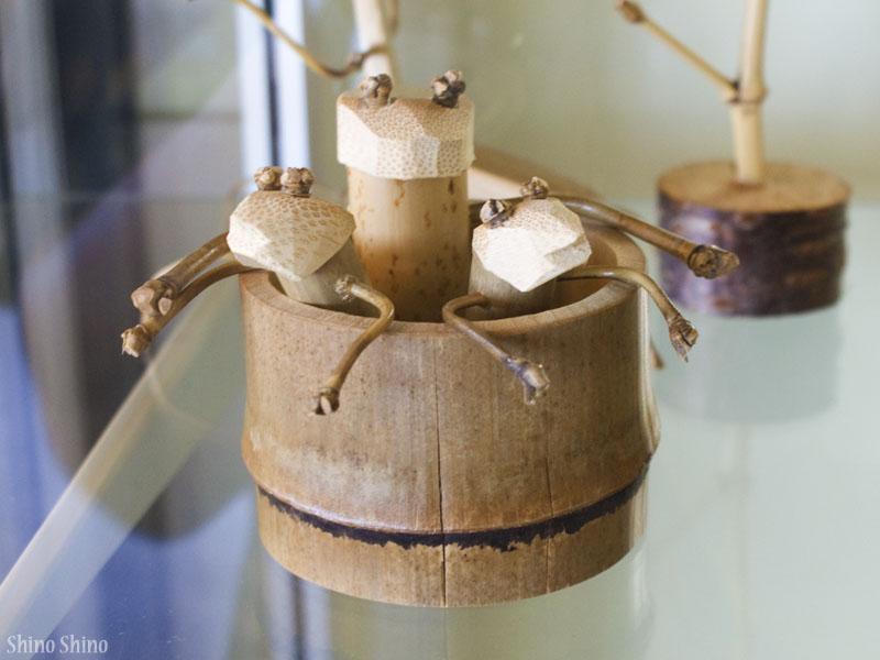勿来の国民宿舎に飾られていた、風呂に入った竹細工のカエルたち。