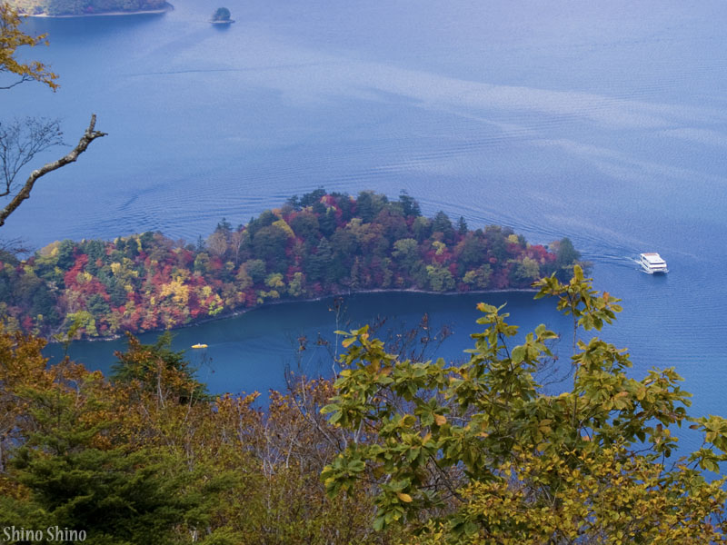 ▲半月山第1駐車場から見下ろした、中禅寺湖八丁出島と遊覧船。