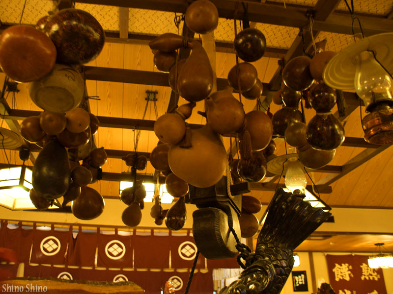 いろり端風テーブルの上には沢山の瓢箪が吊されておりました。