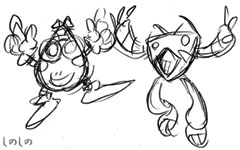 ▲楽しそうにはしゃぐ、ロボーンとニャンマーのラフ絵。