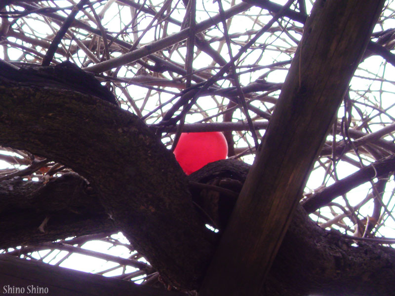▲赤い物体は何? 答:木蔓屋根の上に乗っかったビニール玉。