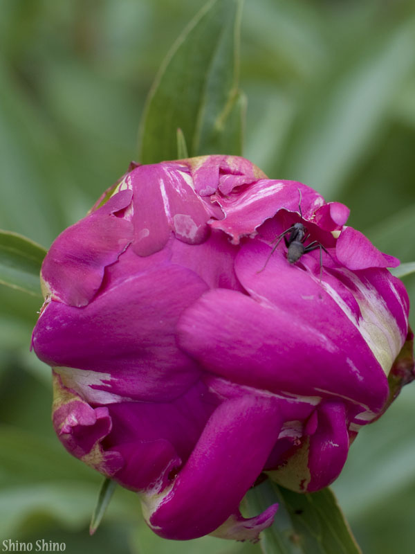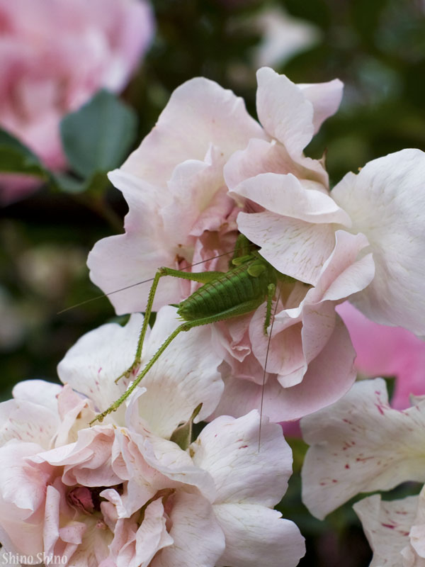 ▲バラに頭を突っ込んだキリギリス。蜜ではなく蜜を吸う
