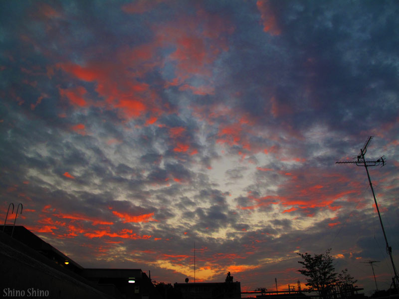 ▲本日の夕空風景。散り散りとなったウロコ雲が朱に染まり