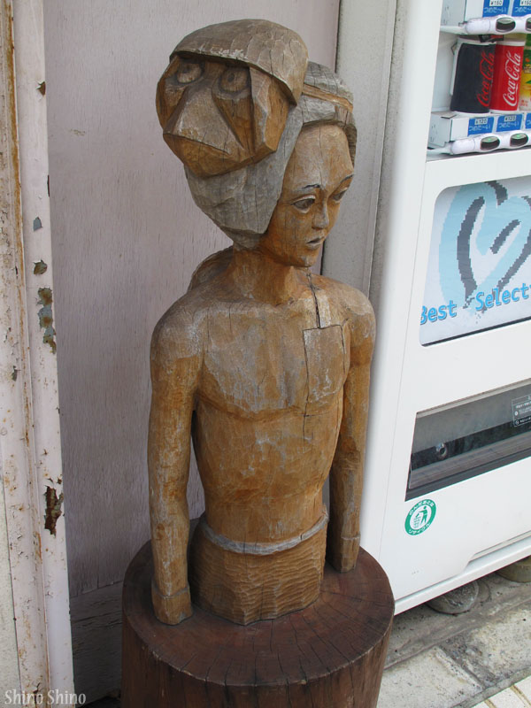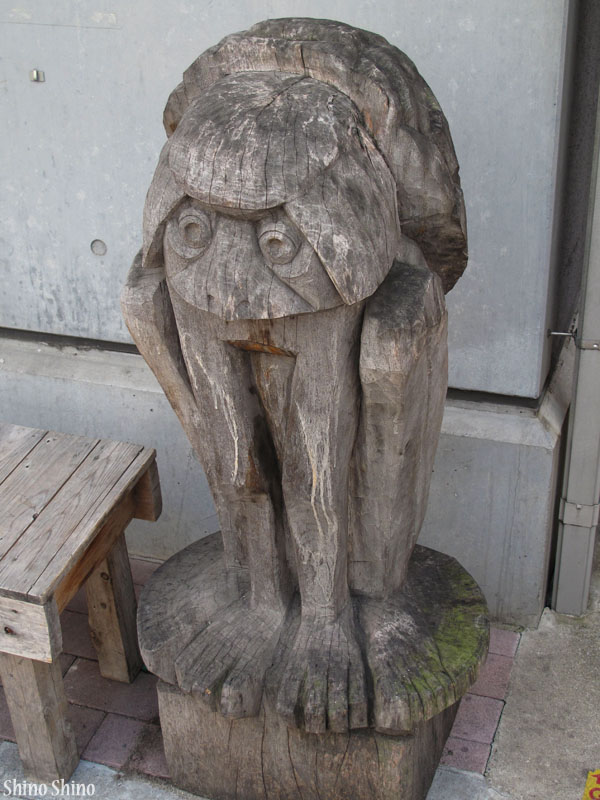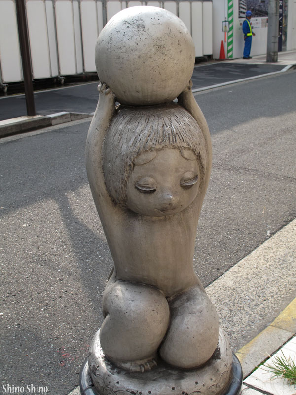 ▲河童のお面を頭に付ける女性の像だと思うのですが、