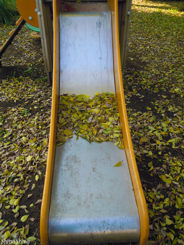 ▲すべり台と落ち葉風景。木々が丸坊主となるのもあっという間