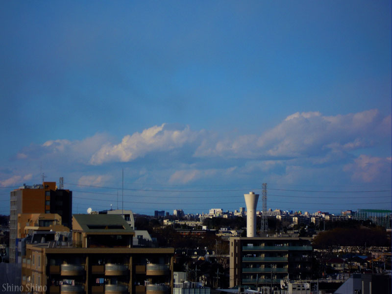 ▲南西方向。多磨方面上空にネジレ雲が延々と続いております。