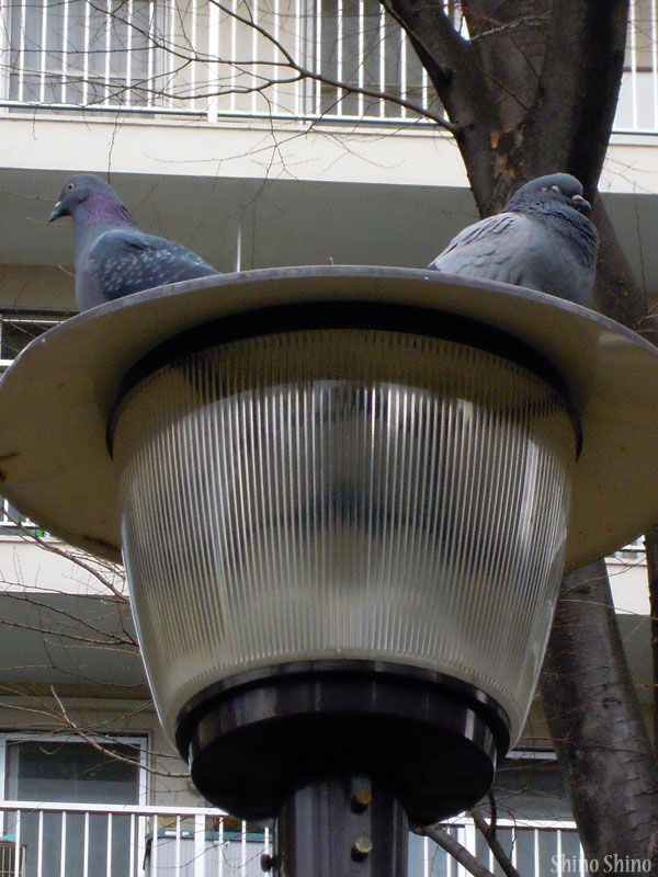 ▲街頭の上にちょこんとうずくまる2羽のハト。